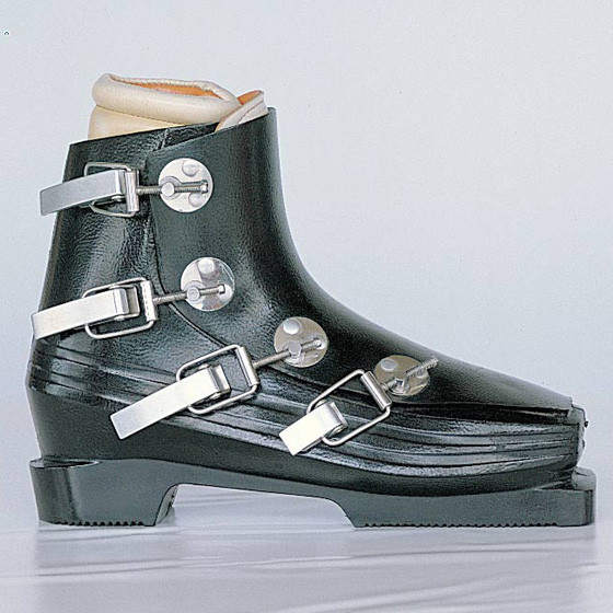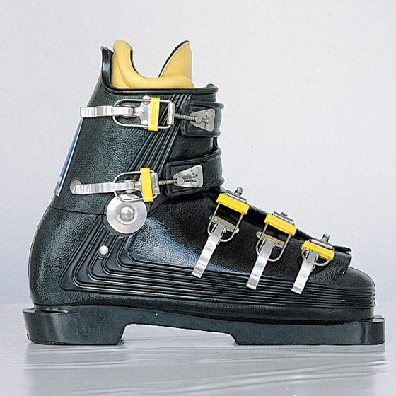 Lange introduces the first plastic ski boot with metal buckles.